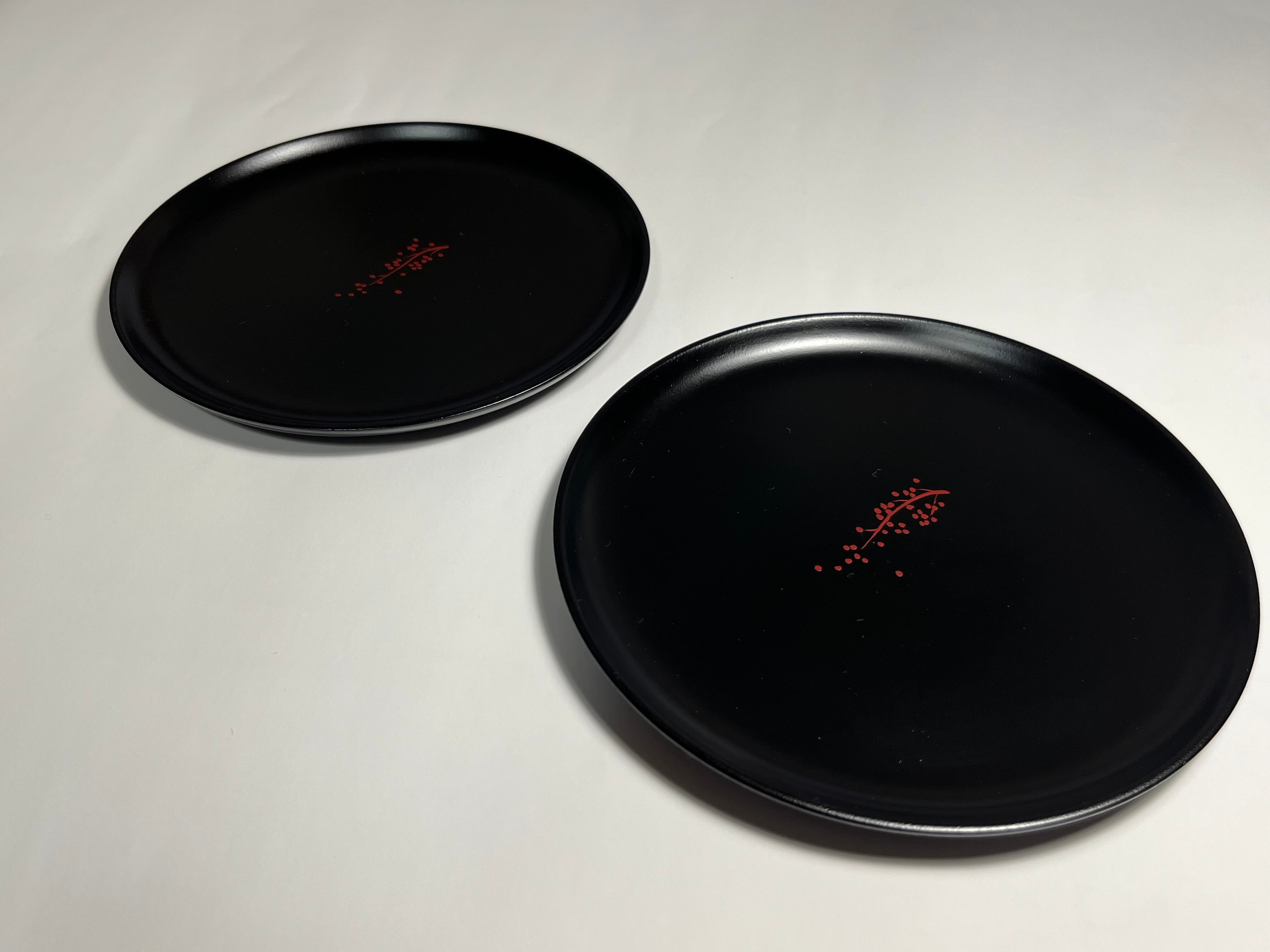 南天を中央にあしらった漆塗りの軽くて平たいお皿です。