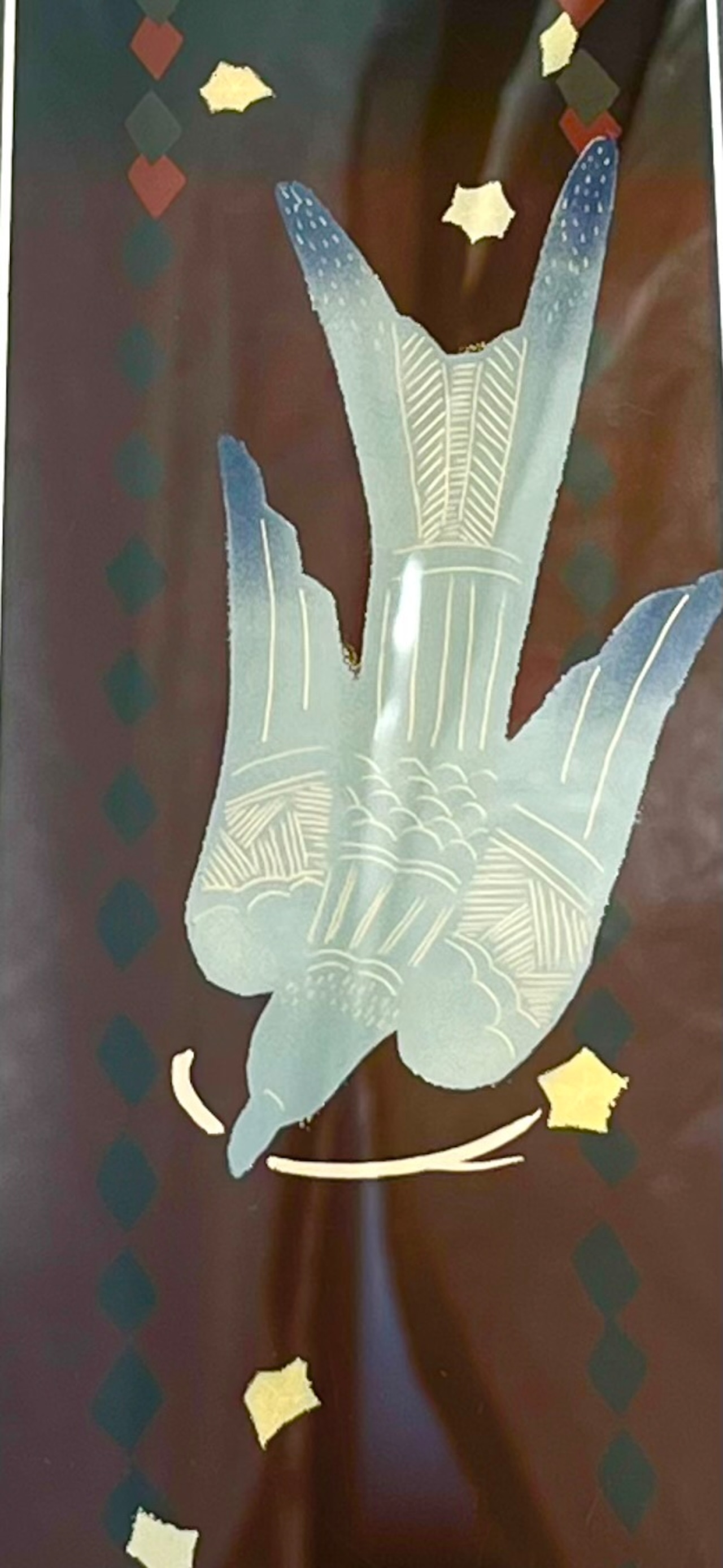 アクリルに、色漆をのせたり彫ったりして鳥を描きました。